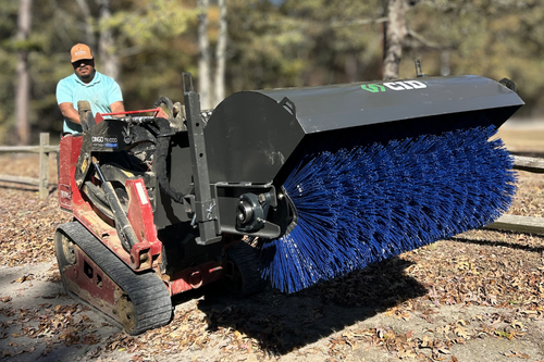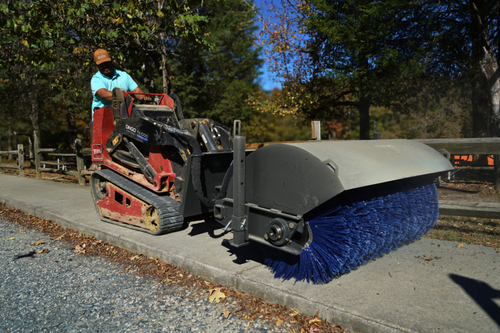 Mini skid steer broom built for sweeping dirt, snow, and debris with efficiency. This manual angle broom features a 48″ sweeping width, 26″ bristles, and a durable 8″ core for reliable cleanup in tight spaces. With a 30° manual angle adjustment left or right, it provides flexibility for sidewalks, driveways, and property maintenance.
