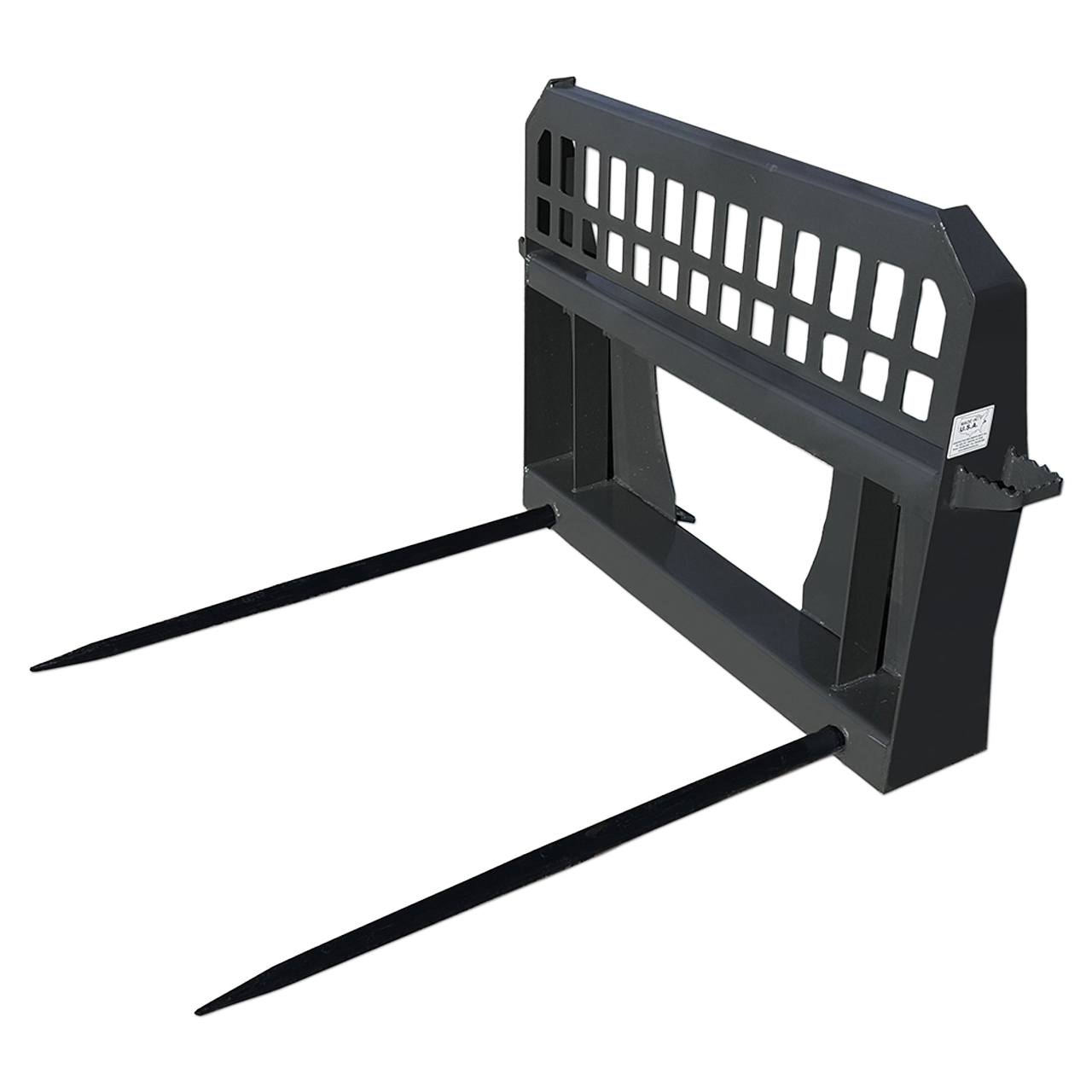 | Our High Back Hay Spear is designed to increase your leverage and safety when rolling the bales back towards the cab. Hay Spears easily move bales of hay with a quick hook up on your skid steer or tractor. Euro style and John Deere mounts are available. |