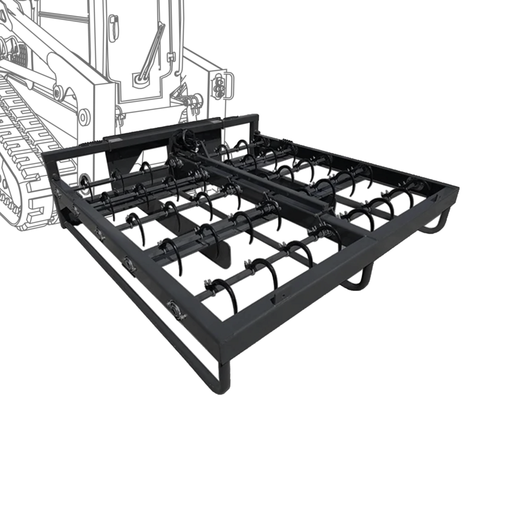 The Accumulator Grapple allows one man and a skid steer to gather 8 to 10 square bales, grapple them, lift and off load to a trailer. Lessen the number of people required to clear the fields, increase your profitability and time savings with one purchase! No need for multiple pieces of equipment, this is all operated from inside the skid steer using the Accumulator Grapple. Sides and dividers can be removed for more efficient grappling.
