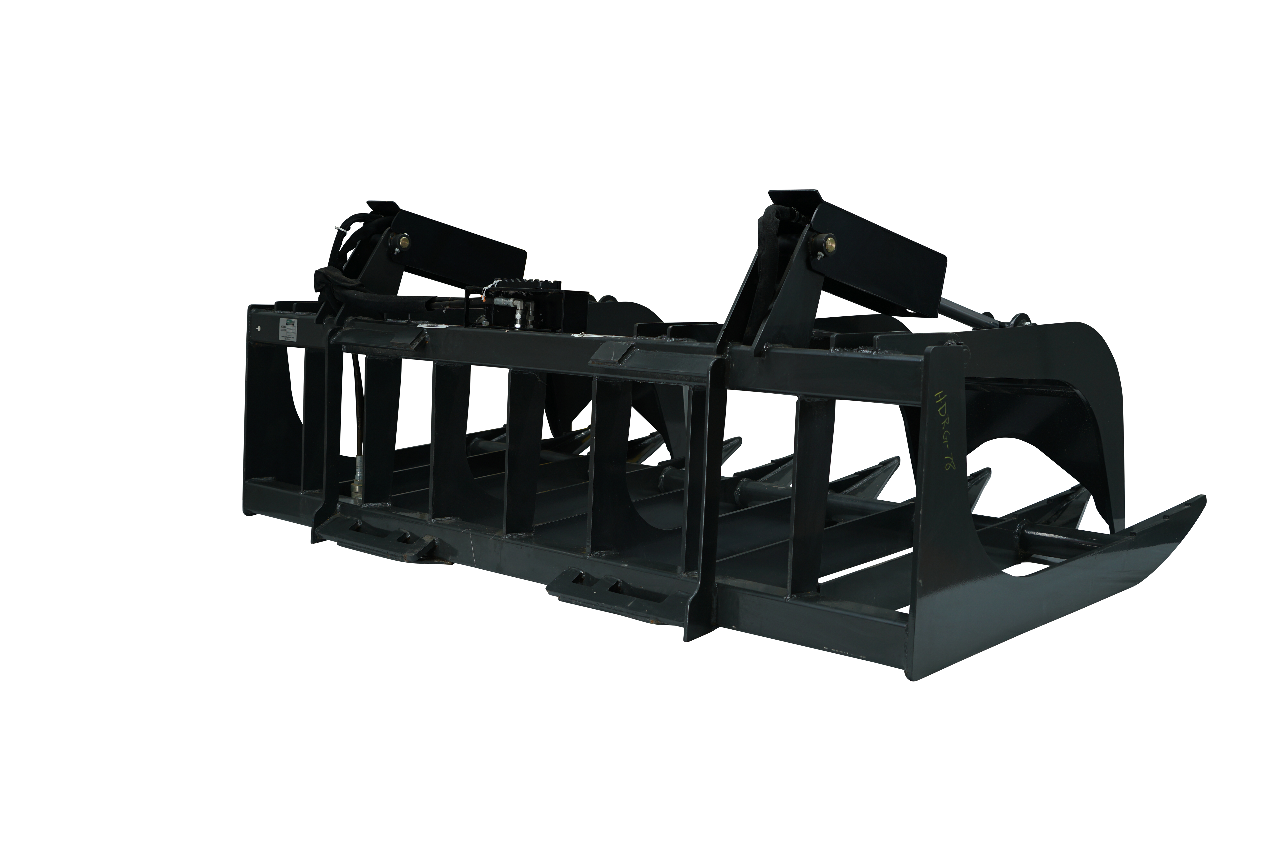 Our root grapples are a necessity in the tree industry, and for contractors clearing lots for home site building. They are ideal for moving logs, brush, rocks or just about any type of debris, which makes them essential tools for storm damage clean up. All of our units are built from top quality steel and will exceed the lifting capacity of the skid steer machines they are used on. Our grapples feature independently operated cylinder(s) to adjust uneven loads. They also feature grease fittings at every pivot point, and commonly come with rod covers which is a must have. This unit is rated for 45HP and under, has 2×10 cylinders, hydraulic lines routed inside the frame for protection, has 1/2″ steel plate on top and bottom and is built with 3″ square tubing.