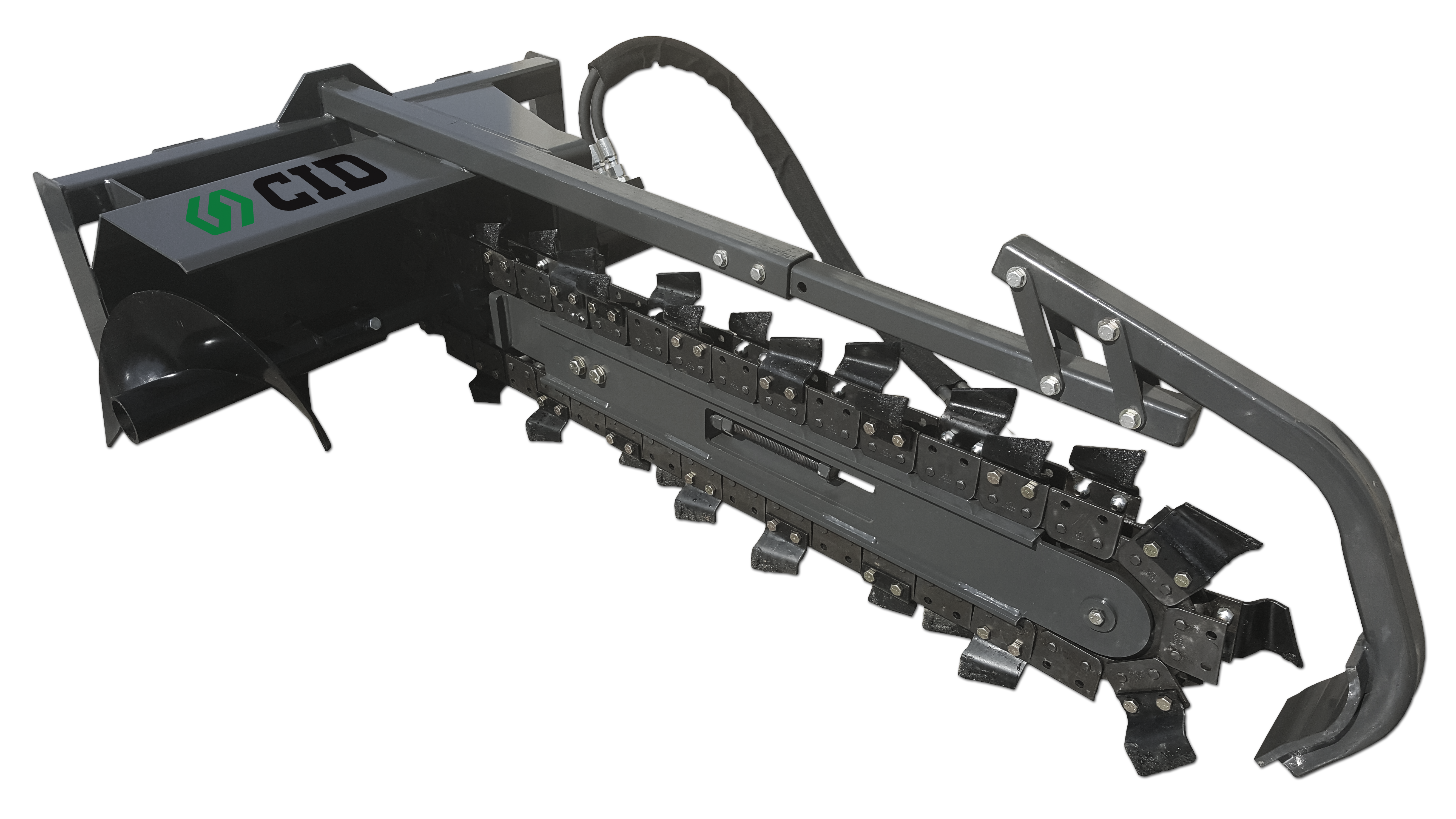Our X-treme Skid Steer Trencher is ideal for quickly trenching water lines and cable lines. With options for a dirt chain, 1/2 rock & frost, or full rock & frost, we have the right chain for your trenching needs. There are two arm sizes for different digging depths and chain widths of 36″ or 48″. These trenchers come with a full rock guard and offer flow options of 15-20 GPM or 20-30 GPM, featuring a 15″ auger. The chain guard can be removed for getting right up alongside buildings or structures for less finish digging. The trencher also features easy tightening, and replacable blades for the chain.